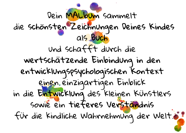 Es ist ganz einfach: Du suchst Deine Lieblingszeichnungen des Kindes aus, schickst sie zu uns und wir arrangieren sie und ordnen sie anhand wertschätzender Kommentare in den entwicklungspsychologischen Kontext ein, bevor wir sie zu einem wunderschönen und einzigartigen Bildband binden lassen. Zusammen mit dem MALbum bekommst Du Deine Originale zugesendet!
