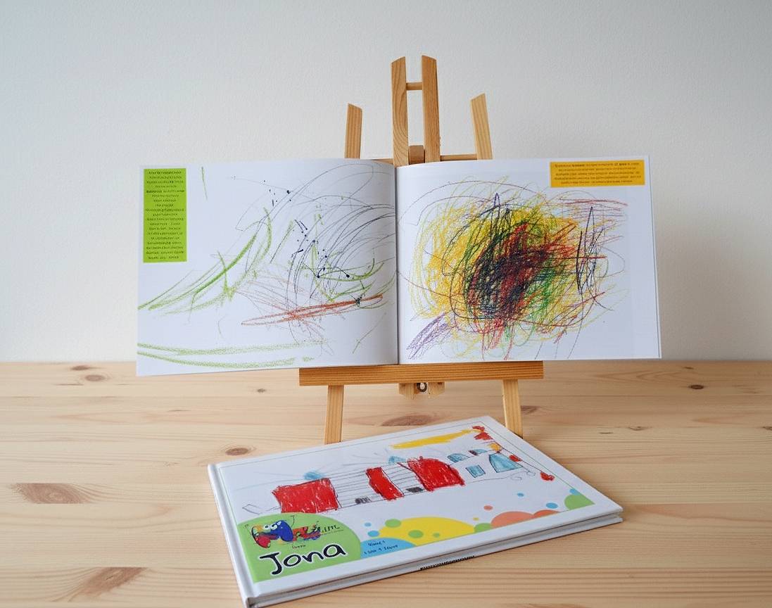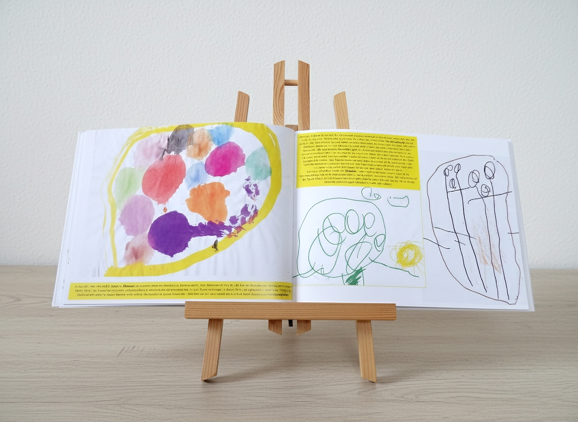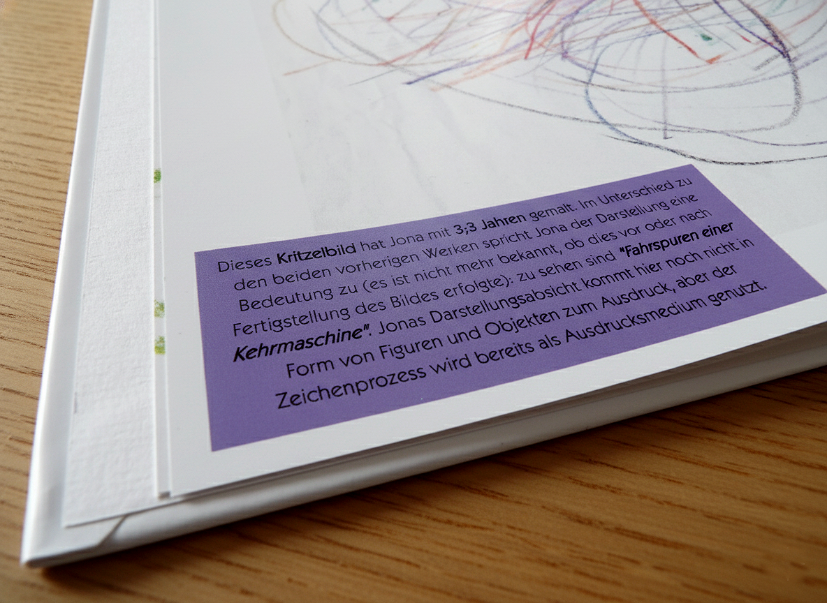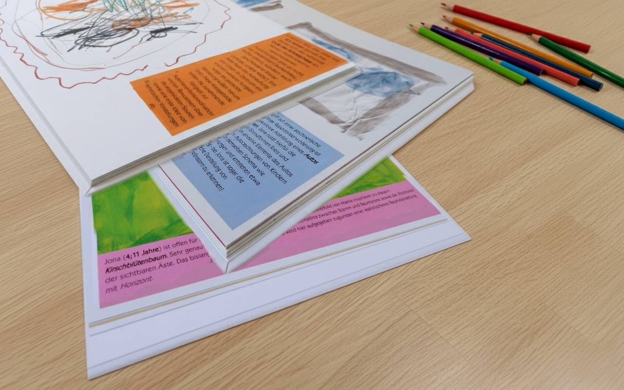 Es sammelt die von den Eltern und Kindern ausgewählten Kinderzeichnungen in einem ansprechenden Bildband, in welchem sie in eine schlüssige Reihenfolge gebracht und in die Entwicklungsphasen des Zeichnens eingeordnet sowie wertschätzend und informativ aus entwicklungspsychologischer Sicht kommentiert werden.